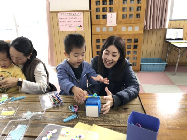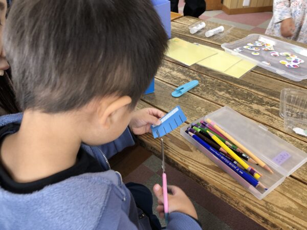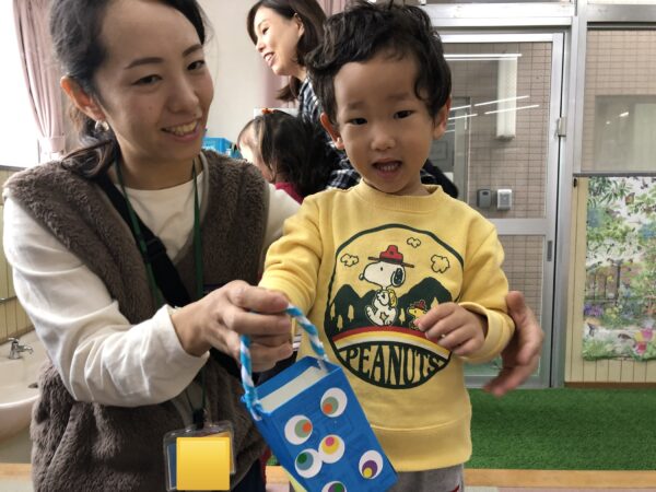 登園後、まずはハロウィンパーティーに向けて、モンスターのキャンディバッグを作りました。これまでハサミの一回切りやシール貼り等いろいろな工作をしてきたので、今回は親子で自由に工作を楽しんでもらいました。目がいっぱいのモンスター、もじゃもじゃモンスター、個性豊かなモンスターバッグ。ハロウィンパーティーが楽しみになりましたね♪