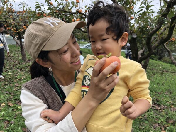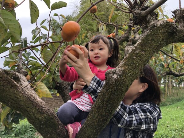 そして最後には柿畑にもお散歩をして、柿もぎもしましたよ。畑にはおしりが四角い柿は次郎柿、丸くて小ぶりな柿が富有柿の二種類があります。どの柿がいいかな?