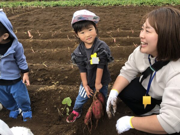 畑へ着くと、園長先生とバスの菊地先生がおいもの掘り方を教えてくださり、お手伝いをしてくれました。さぁみんな頑張って掘ってね~!
